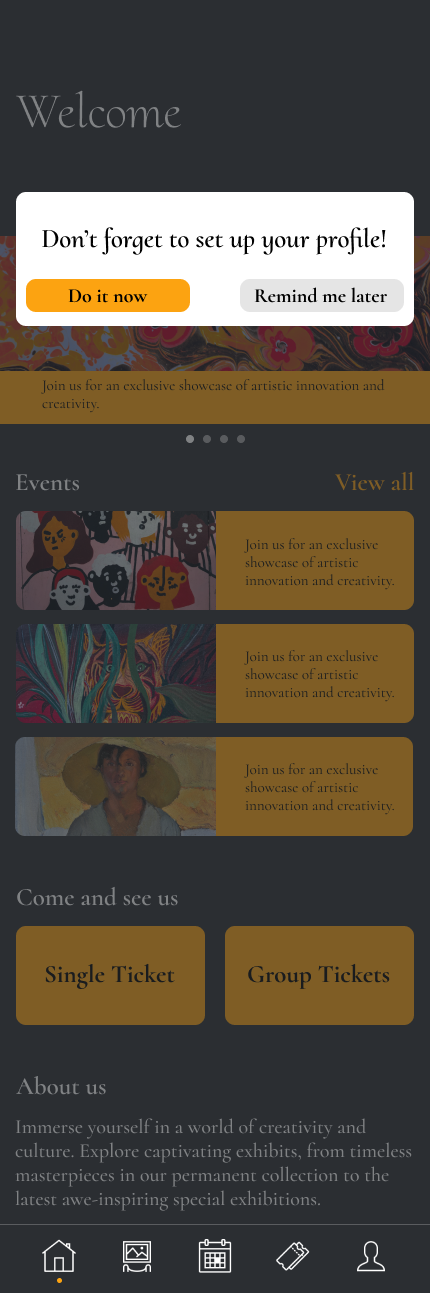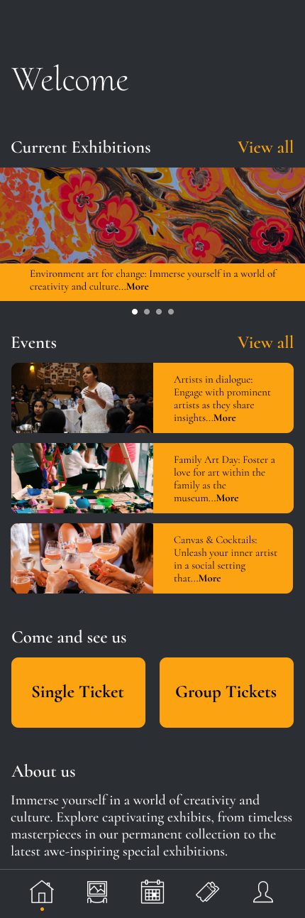 Enhancing people's engagement with their local art scene by streamlining ticket purchases and providing updates on events. This user-friendly app will encourage discovery, exploration, and support for the diverse local art community.