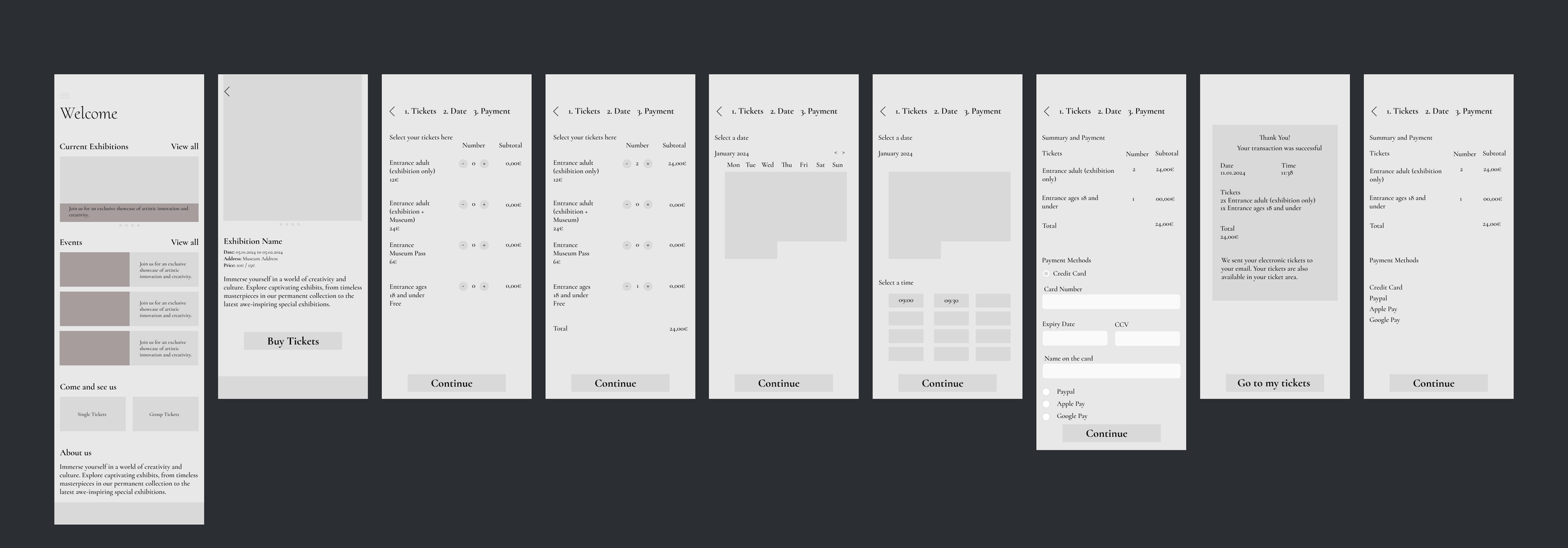 I first started creating low-fi wireframes of the onboarding and the ticket purchase process on my notebook before adding them to Figma.